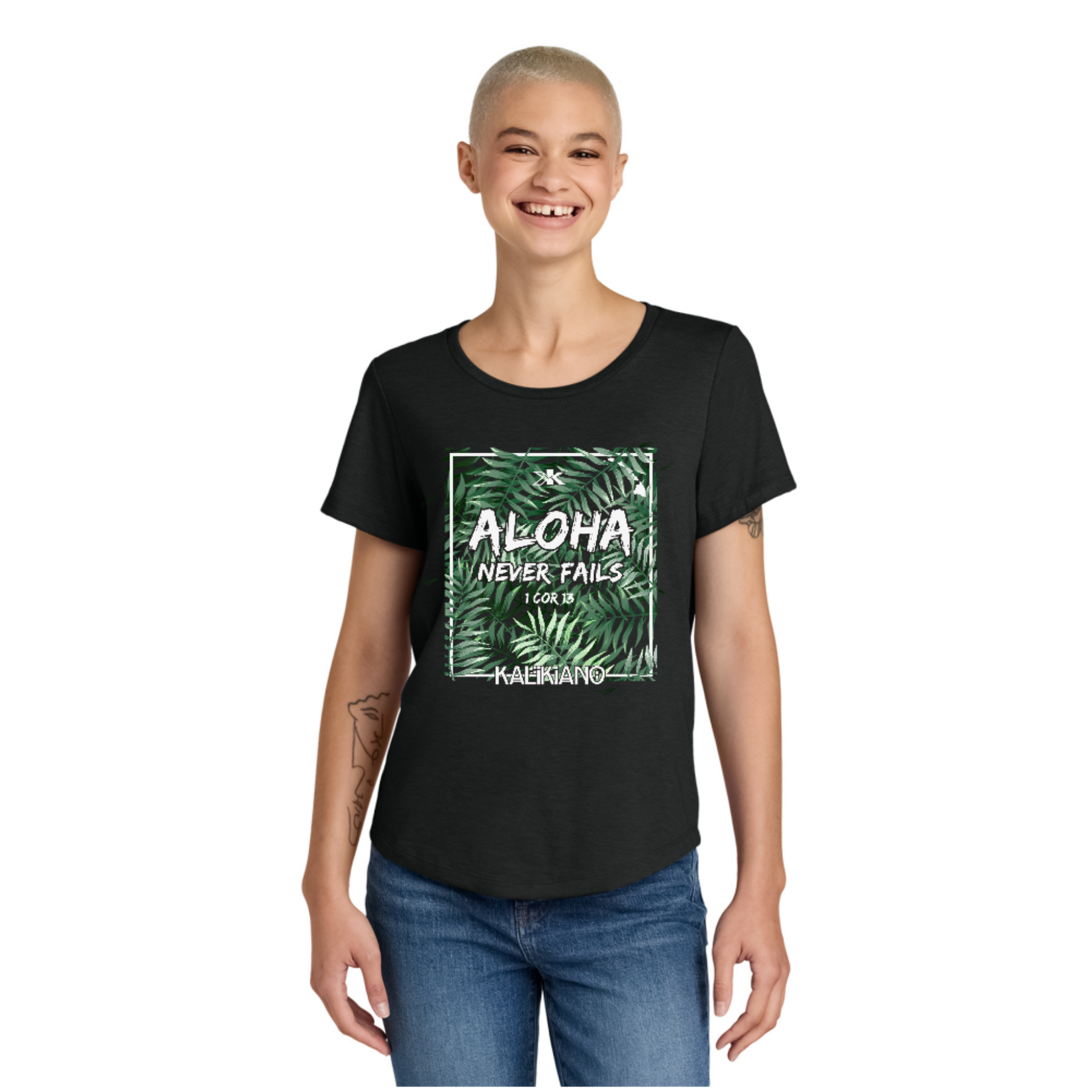 New ladies Aloha Never Fails 4.2-ounce, 50% recycled polyester, 25% organic ring spun cotton, 25% modal flowy scoop neck tee with side seams, shaped hem and a tagless neck label.